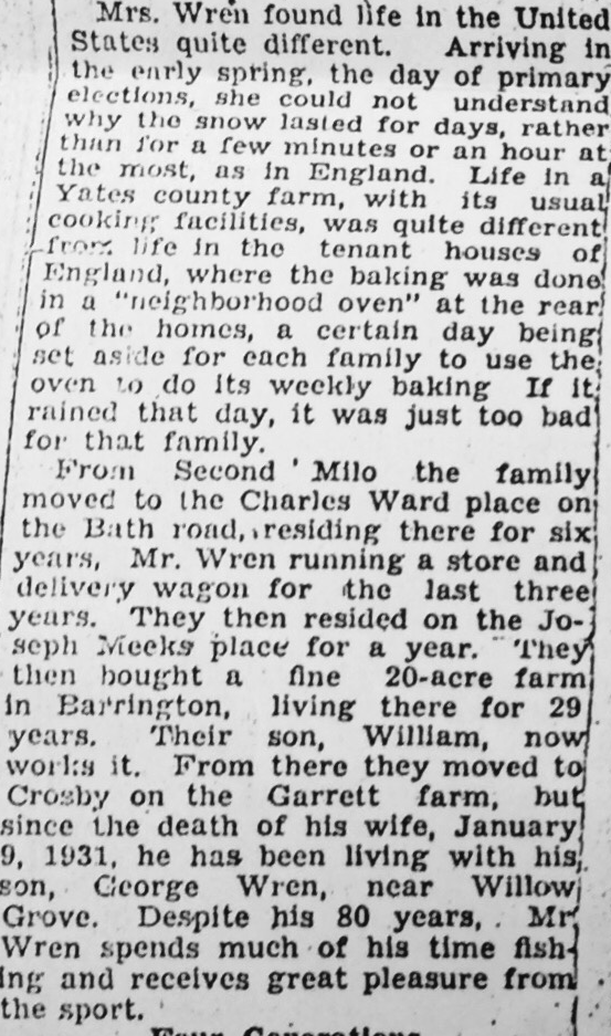 Much more information is available about the youngest of the seven siblings, Alfred Charles Wren (1856 – 1938). Alfred, his wife Emma and their four children left Liverpool in 1885 or 1886, arriving in New York after an arduous ten-day journey that saw the ship blown off course. Their youngest child, Arthur, was only around 10 months old and Emma may even have been pregnant again, as their daughter, Elizabeth Emma was born around 1886 in New York State. Three more children were to follow. The family lived with Elizabeth and Richard for six weeks before finding their own home in Penn Yan, Milo. A local newspaper report marking Alfred’s 80th birthday some years later includes Emma’s own recollections of arriving in the USA and how life in England had been before.